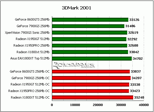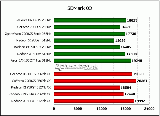 В 3DMark03 без разгона снова лидирует GeForce 8600GTS, а на втором месте – опять Radeon X1800XT. На последнее место переместилась Radeon X1950GT. В целом, картина почти такая же – разогнанные версии видеокарт смотрятся очень хорошо, EAX1800XT TOP опять обогнала все видеокарты на стандартных частотах. При разгоне ситуация немного изменилась – первое место, благодаря сильному разгону, смогла занять GeForce 7900GS, на втором месте – Radeon X1800XT, на третьем – GeForce 8600GTS. Обе Radeon X1950 при разгоне смотрятся слабее конкурентов.