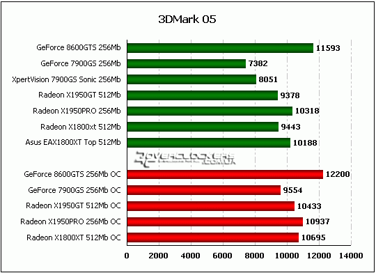В 3DMark 05 снова быстрее всех GeForce 8600GTS, как с разгоном, так и без, причем разница в скорости между первым и вторым местом достаточно велика – более 1000 баллов. Хорошо проявили себя и Radeon X1950, особенно Pro-версия – она обогнала все карты, кроме GeForce 8600GTS. Хуже всех в данном тесте выглядит GeForce 7900GS без разгона – отставание от GeForce 8600GTS составляет чуть менее 4000 баллов.