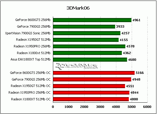 Последний из синтетических тестов, 3DMark 06 демонстрирует уже привычную картину – GeForce 8600GTS снова ощутимо быстрее всех своих конкурентов. На второе место вернулась TOP-версия Radeon X1800XT, среди стандартных карт второе место – у Radeon X1950Pro. Что касается разгона, то тут опять сильно выступила GeForce 7900GS – второе место, затем идут Radeon X1950Pro и Radeon X1800XT, на последнем месте – X1950GT.