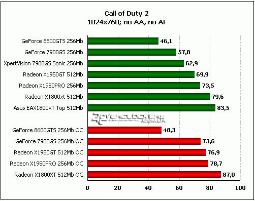 Первое, что сразу же бросается в глаза – огромное отставание GeForce 8600GTS от остальных видеокарт. После оптимистичных результатов во всех 3DMark, такая картина действует как холодный душ. Такое сильное падение скорости можно списать только на недоработку в драйверах. Есть надежда, что в NVidia исправят эту ошибку в ближайших версиях драйверов. Но пока ошибка не исправлена, приходится констатировать факт – новое семейство видеокарт показывает в Call of Duty2 очень низкую скорость - на уровне GeForce 7600GT.