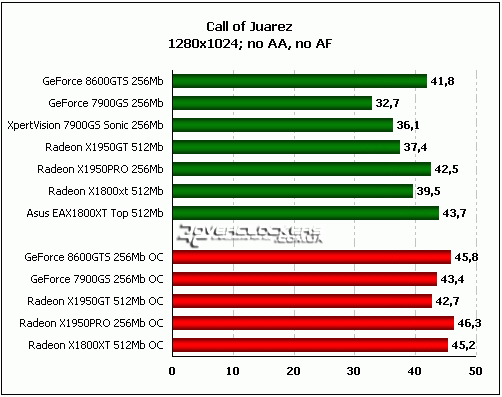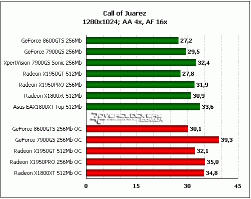 В Call of Juarez GeForce 8600GTS понемногу возвращает утраченные позиции, ощутимо обогнав свою предшественницу – GeForce 7900GS. Но при этом проигрывает конкуренту от ATI в лице Radeon X1950Pro, а при разгоне достаточно близко к этим двум картам подобралась и Radeon X1800XT.