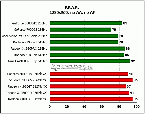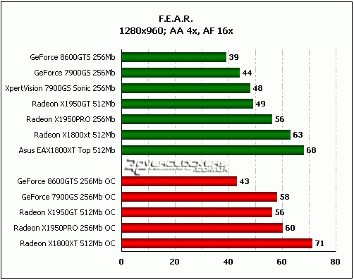 В следующей игре, F.E.A.R., GeForce 8600GTS снова без разгона опережает GeForce 7900GS, но проигрывает Radeon X1950Pro и Radeon X1800XT. А при разгоне на первое место выходят GeForce 7900GS и Radeon X1800XT, а GeForce 8600GTS оказывается на предпоследнем месте, обогнав только X1950GT.