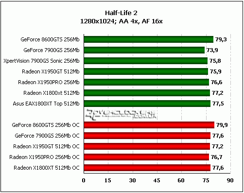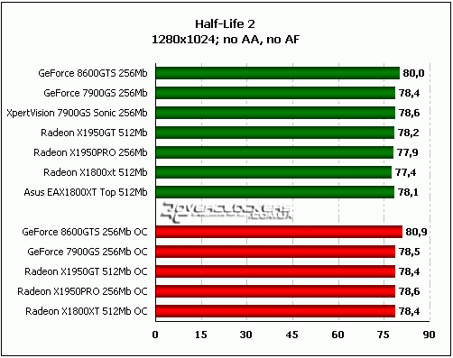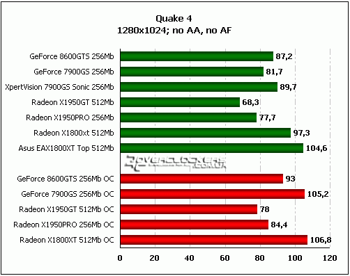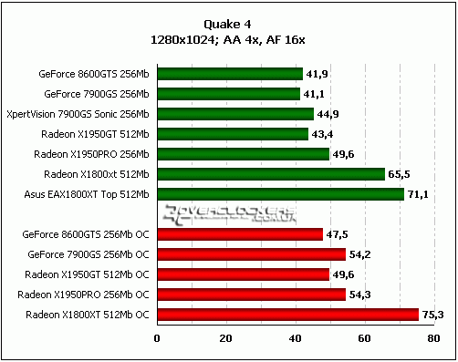 Quake 4 – тут всех почти разгромила самая старая видеокарта в обзоре – Radeon X1800XT. Даже с разгоном только одна видеокарта, GeForce 7900GS, смогла обогнать Radeon X1800XT, работающую на номинальных частотах. Но при этом, с разгоном GeForce 7900GS чуть было не обогнала разогнанную Radeon X1800XT, ей не хватило лишь чуть более 1 кадра в секунду. Слабее всех показали себя Radeon X1950 – как с разгоном, так и без него. GeForce 8600GTS тоже не порадовала – она немного быстрее GeForce 7900GS в номинале, и сильно проигрывает ей при разгоне.