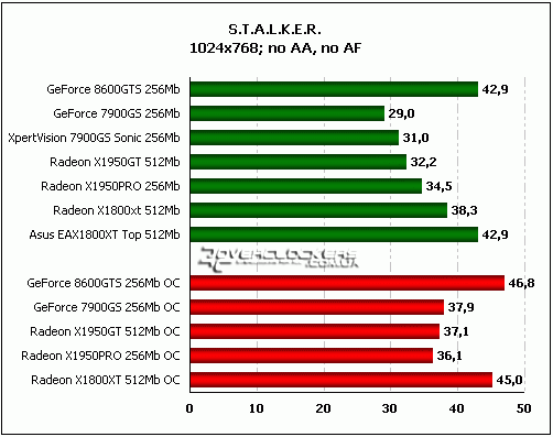 И, наконец, S.T.A.L.K.E.R. – тут GeForce 8600GTS проявила себя с лучшей стороны, она намного обогнала всех своих конкурентов, и этот праздник ей омрачают результаты только одной видеокарты – Radeon X1800XT. В номинале TOP-версия показывает такую же скорость, а при разгоне X1800XT проиграла немного – чуть менее 2 fps. Из остальных карт, прежде всего, отметим Radeon X1950GT – на этот раз, при разгоне, 512 Мб памяти позволили этой видеокарте даже обогнать разогнанную Radeon X1950Pro. Кроем этого, высокие частоты разогнанной GeForce 7900GS позволили ей занять третье место среди разогнанных карт, при этом без разгона эта видеокарта была самой медленной.