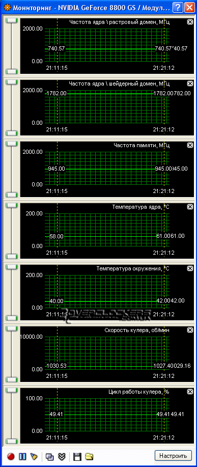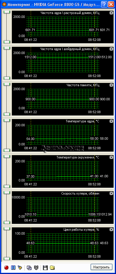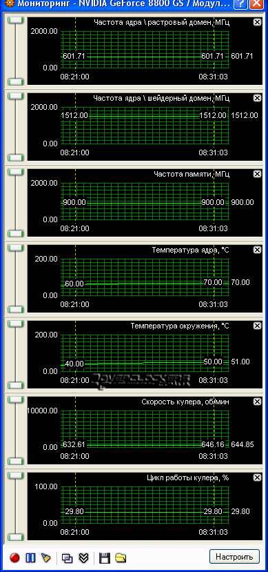 Рабочие частоты данной видеокарты следующие: ядро - 602 МГц, щейдерный домен - 1512 МГц, память – 900 МГц (1800 МГц эффективной частоты). При этом можно отслеживать не только температуру чипа, но и платы. Мониторятся показания таходатчика вентилятора, и кроме его процентных значений, мы видим реальные обороты. Изначально вентилятор работает на 650 об/мин, при этом он абсолютно бесшумен. Но ядро прогревается под нагрузкой "волосатым кубом" до 70°С.