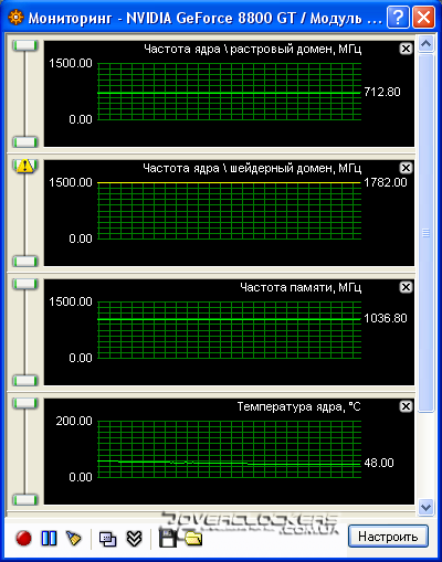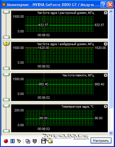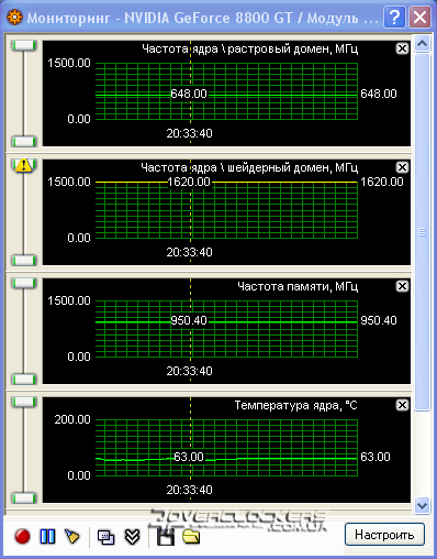 С помощью программы RivaTuner 2.06 осуществлялся мониторинг и разгон данной видеокарты. Оказалось, что рабочая частота чипа немного ниже заявленной и составляет 633 МГц, при этом шейдерный домен работает на частоте 1620 МГц.
