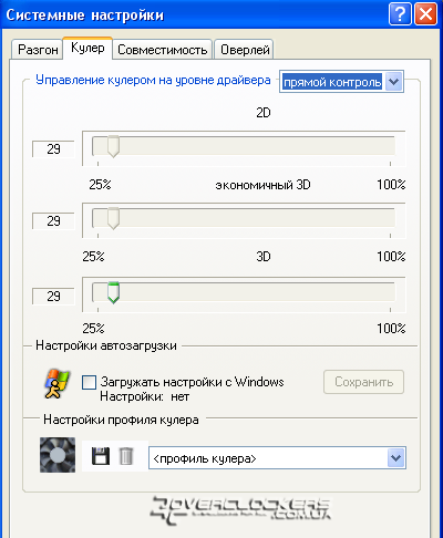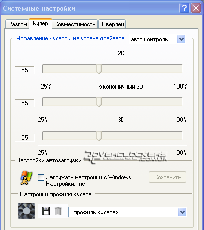Вентилятор способен раскрутиться до 55%, при этом шум его, в отличие от турбины, слабо слышен. На меньших оборотах его работа уже практически бесшумна. Правда, при старте системного блока придется первые пару секунд мириться с гулом кулера на максимальных оборотах, но это присуще и всем GeForce 8800GT с референсным дизайном.
