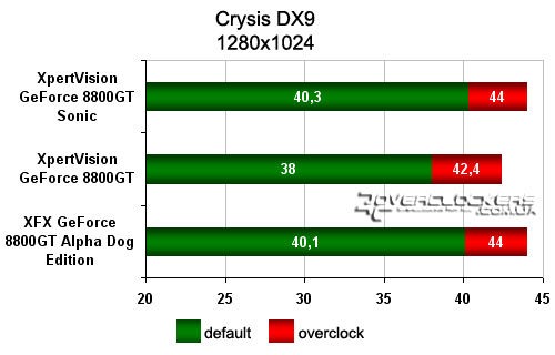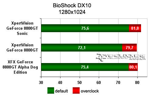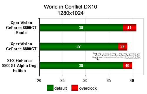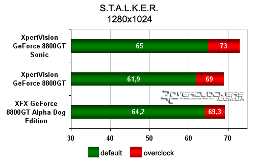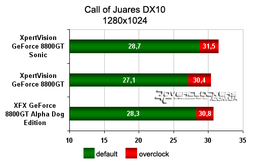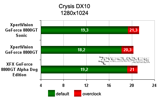 В этой XpertVision GeForce 8800GT стабильно уступает 5%, а разница между XFX GeForce 8800GT и XpertVision GeForce 8800GT Sonic меньше 1%, с разгоном чуть больше 1%. Разгон позволяет выиграть всем картам в этой игре 10%, но этого очень мало, чтобы обеспечить нормальный fps с такими настройками графики.