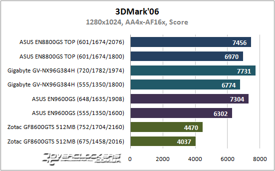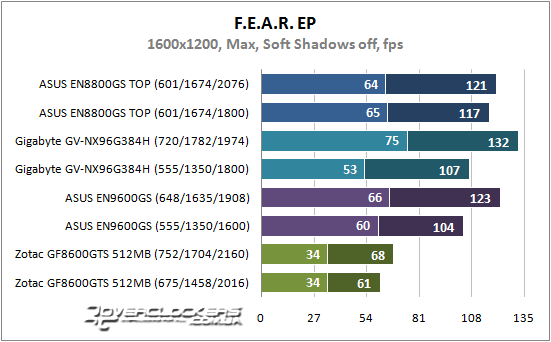 В синтетическом пакете видеокарта на базе GeForce 8600 GTS, как и следовало ожидать, демонстрирует более низкий результат по сравнению с остальными участниками, при этом разница достигает 1,5 раза. Как мы и предполагали, акселератор Gigabyte GV-NX96G384H за счет большей частоты памяти производительней ASUS EN9600GSO со стандартными характеристиками. Кроме того, в данном тесте низкую ПСП можно компенсировать частотой GPU, чему доказательство результат карты от Gigabyte и ASUS EN8800GS TOP при разгоне.