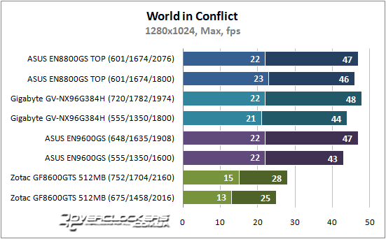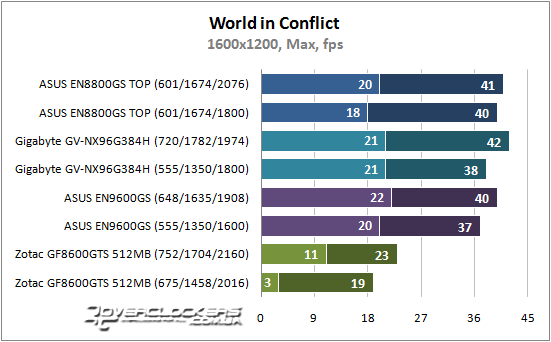 Для стратегии реального времени World in Conflict расстановка сил не поменялась и с ростом разрешения просадка fps в среднем достигает 20 кадров в секунду. На GeForce 8600 GTS вообще противопоказано играть при высоком разрешении и качественной графике, иначе RTS превратится уже в пошаговую стратегию.