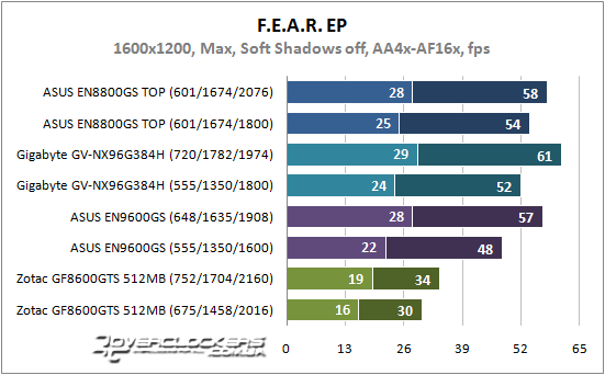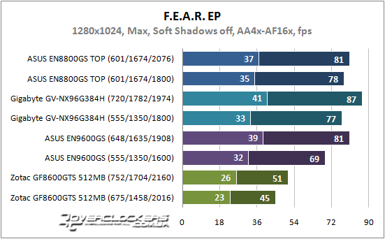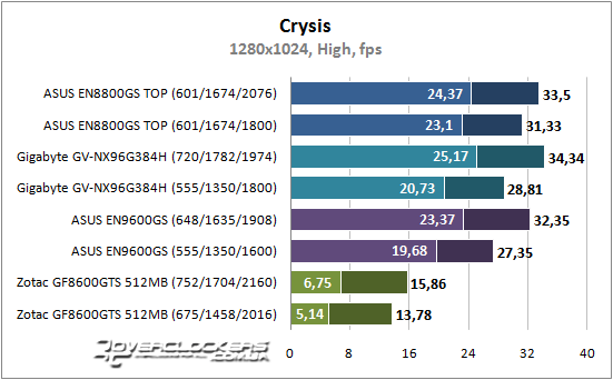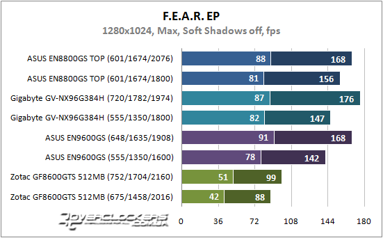 Старенькая игрушка чувствительна в вычислительной мощи GPU и GeForce 9600 GSO с большей частотой ядра при разгоне оказывается производительней карты GeForce 8800 GS с хорошо разогнанной памятью. Теперешний представитель low-end неплохо справляется с нагрузкой, а значит, он просто создан для игр четырехлетней давности.