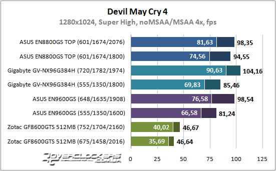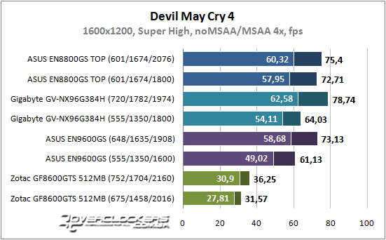 В Devil May Cry 4 можно поиграть и на GeForce 8600 GTS без активации сглаживания. Результаты остальных участников расположились на графике без изменений. Частота графического процессора опять выполняет решающую роль.