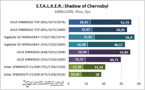 S.T.A.L.K.E.R.: Shadow of Chernobyl хоть и оброс «бородой», но максимальные настройки графики явно не для бюджетной карты. Хотя, за такие деньги ей полагалось бы демонстрировать результат процентов на 20-30 больше. Но, увы, GeForce 8600 GTS как был неоправданно оценен при выходе в свет, так и остался, хоть и подешевел с того момента в 3-4 раза. Для GeForce 9600 GSO и 8800 GS данная игра уже не представляет серьезное испытание, но с ростом разрешения минимальный fps будет падать до 15 кадров, что в жарком бою вряд ли кого устроит.