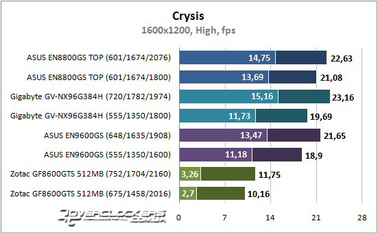 Для тестирования в игре Crysis была выбрана демо-запись Assault Harbor, которая показывает реальную нагрузку во время игры. Наш пионер унифицированной архитектуры оставляет желать лучшего и для прохождения игры придется выбирать настройки ниже среднего уровня. Карты классом выше уже должны обладать и большой пропускной способностью памяти и высокой частотой GPU. Выставление высокого разрешения обязательно должно сопровождаться снижением качества графики, иначе минимальный fps выйдет за порог играбельности.