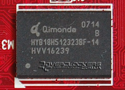 На плате распаяны микросхемы памяти Qimonda, которые, судя по маркировке, вроде как рассчитаны лишь на 1400 МГц, но работают на положенных для этих карт 1800 МГц.