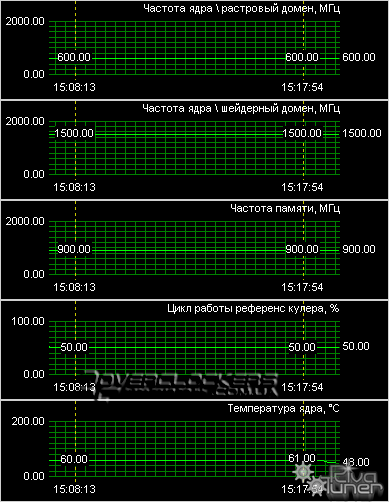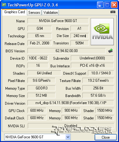 Как упоминалось выше, рабочие частоты соответствуют стандартным спецификациям GeForce 9600 GT Green Edition — 600/1500/1800 МГц.