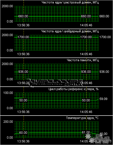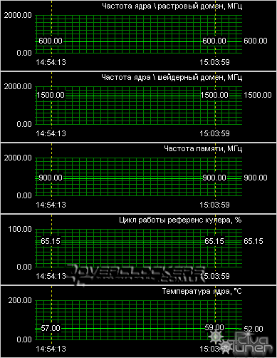 На номинальных частотах в стресс-тесте ATI Tool ядро не прогревалось выше 59 ºC, что свидетельствует о достаточно высокой эффективности (как для такого GPU) родной системы охлаждения. Отметим, что в Riva Tuner обороты в процентном соотношении обороты отображаются как дельта до максимума, т.е. 65% на скриншоте соответствуют 35% от реального максимума (что уже верно отображалось на вкладке регулирования оборотов), поэтому с повышением скорости вентилятора на скриншотах вы можете наблюдать «падение» (а реально увеличение) этого параметра.