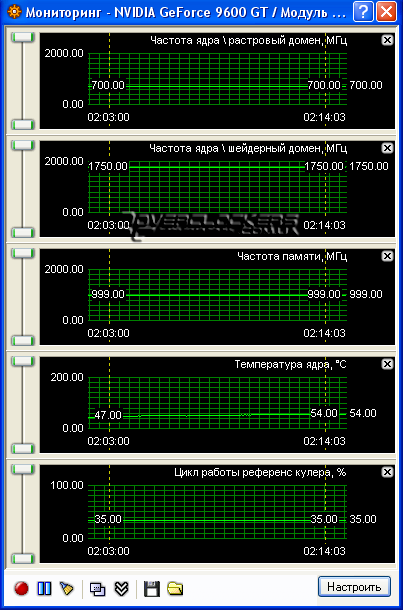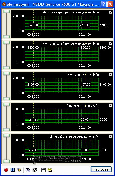 Вместо рекомендованных частот 650/1600/1800 МГц (растровый/шейдерный домен/память) модель Sonic изначально работает на 700/1750/2000 МГц. При нагрузке видеокарты тестом "волосатого куба" ATIToll температура чипа не поднималась выше 54°C. Родная система охлаждения, надо признать, отлично справляется со своей задачей. Температура даже ниже на 5°C чем у обычной XpertVision GeForce 9600GT, рассмотренной в предыдущей статье, хотя у видеокарт одинаковый по конструкции кулер на графическом ядре. Сомнительно, что чипы G94, отобранные для версии Sonic, настолько "холоднее". Возможно, немного врет датчик температуры. Вентилятор вращается на 35% от максимума, в таком режиме шум практически отсутствует. При желании скорость оборотов можно поднять, к примеру из утилиты RivaTuner. Стоит также отметить, что до установки драйверов вентилятор работает на максимуме, создавая громкий гул.