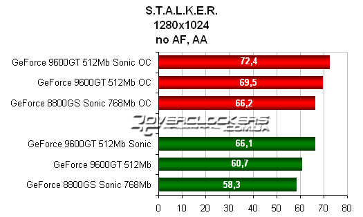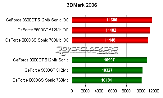 В синтетическом тесте вполне ожидаемо первое место занимает GeForce 9600GT Sonic, на 6 % обгоняя простую версию GeForce 9600GT и на 8 % GeForce 8800GS Sonic. С разгоном цифры немного меняются, но расстановка сил остается прежней.