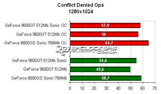 Эта игра еще раз демонстрирует превосходство GeForce 8800GS 768MB Sonic над видеокартами серии 9600. Интересно, что несмотря на более высокие частоты, результаты этих двух видеокарт почти идентичны. С разгоном все видеокарты показывают практически одинаковый результат.