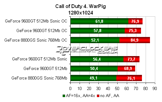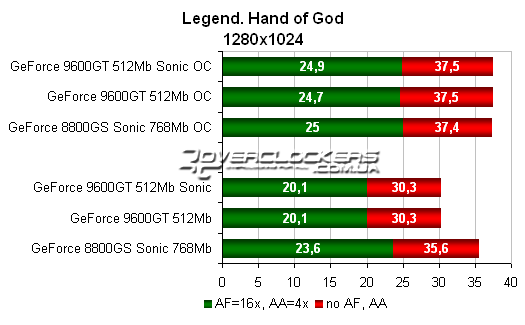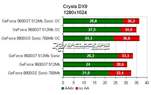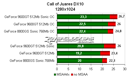 Без сглаживания неплохо проявляет себя GeForce 8800GS 768MB Sonic, обгоняя GeForce 9600GT, а с разгоном уже и обоих новичков. Но в тяжелом режиме, как обычно, она уступает видеокартам 9-й серии. Преимущество GeForce 9600GT Sonic над своим собратом на номинальных частотах 9%, с разгоном 4 %.