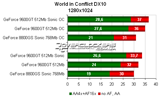 В данной игре представители нового поколения не оставляют шансов GeForce 8800GS 768MB Sonic, обгоняя ее. Особенно огромен отрыв GeForce 9600GT Sonic от представителя старого поколения в режиме со сглаживанием, до 40%. Без антиалиасинга разница между ними меньше, но тоже довольно значительна – 12-19 %. Отставание обычной GeForce 9600GT от лидера до 10% на штатных частотах и лишь 3% с разгоном.
