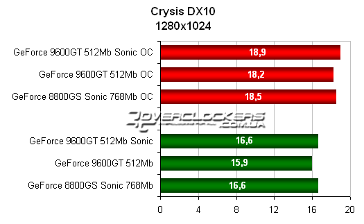Без разгона GeForce 9600GT Sonic и GeForce 8800GS Sonic показывают одинаковый результат, простая GeForce 9600GT отстает на 4%. С разгоном быстрее всех оказывается GeForce 9600GT Sonic, но лишь на 2-4 % она обгоняет соперников. Но даже повышенные частоты не помогает данным видеокартам показать пристойный игровой FPS в данной игре. Так что в Crysis на данных видеокартах вы сможете комфортно поиграть лишь под DirectX 9.