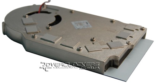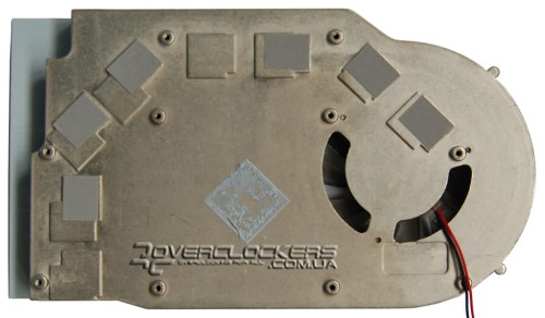 В конструкции кулера используется литое алюминиевое основание с приклеенными тонкими алюминиевыми ребрами и тепловая трубка, которая по желобку проходит в районе расположения графического процессора. Данная трубка передает тепло задней части ребер и основанию возле вентилятора, который прогоняет воздух в сторону силовой подсистемы карты. Контакт с чипами памяти происходит через тонкие термопрокладки, а с ядром посредством обычной термопасты.