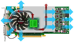 Возможно, подобная конструкция позволяет повысить эффективность СО, учитывая еще и размеры вентилятора, но он оказался самым шумным среди всех тестируемых нами видеокарт на базе GeForce 9600 GT. Благо его оборотами можно управлять, несмотря на двухконтактное подключение.