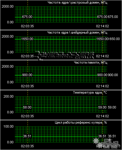 Рабочие частоты ядра немного выше рекомендованных — растровый домен работает на 675 МГц, шейдерный на 1650 МГц. Память работает на положенных ей 1800 МГц. В нагрузке «волосатым кубом» ATI Tool ядро прогрелось до 59 °C при том, что вентилятор раскрутился чуть ли не до 70% от своего максимума и уровень шума был уже довольно таки высоким.