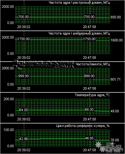 Карта работает на частоте ядра в 750 МГц (потоковые процессоры на 1750 МГц), память на 1998 МГц. В 2D рабочие частоты снижаются до 650/1600 МГц и 1204 МГц, для ядра и памяти соответственно.