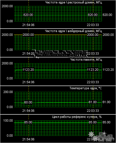 Разгон составил 820 МГц по ядру, для шейдерных блоков — 2000 МГц, а память стабильно работала на 2246 МГц. Обороты вентилятора были подняты до 85%.