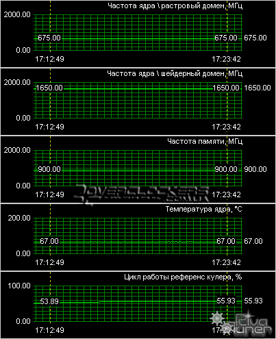 Рабочие частоты данной видеокарты — 675/1650 МГц для растрового и шейдерного доменов и 1800 МГц для памяти. Система охлаждения отличается умеренным уровнем шума, а в простое ее не слышно вообще. В стресс-тесте ATI Tool ядро не прогревалось выше 67 °C.