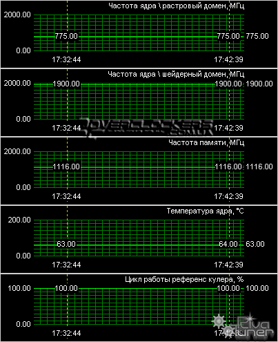 Ядро разогналось до частоты 775 МГц, шейдерные блоки до 1900 МГц, а память — до 2232 МГц.