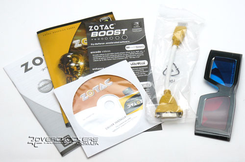 Видеокарта поставляется в небольшой коробке фирменного дизайна, на которой кроме характеристик продукта есть пометка о наличии в комплекте анаглифических очков.