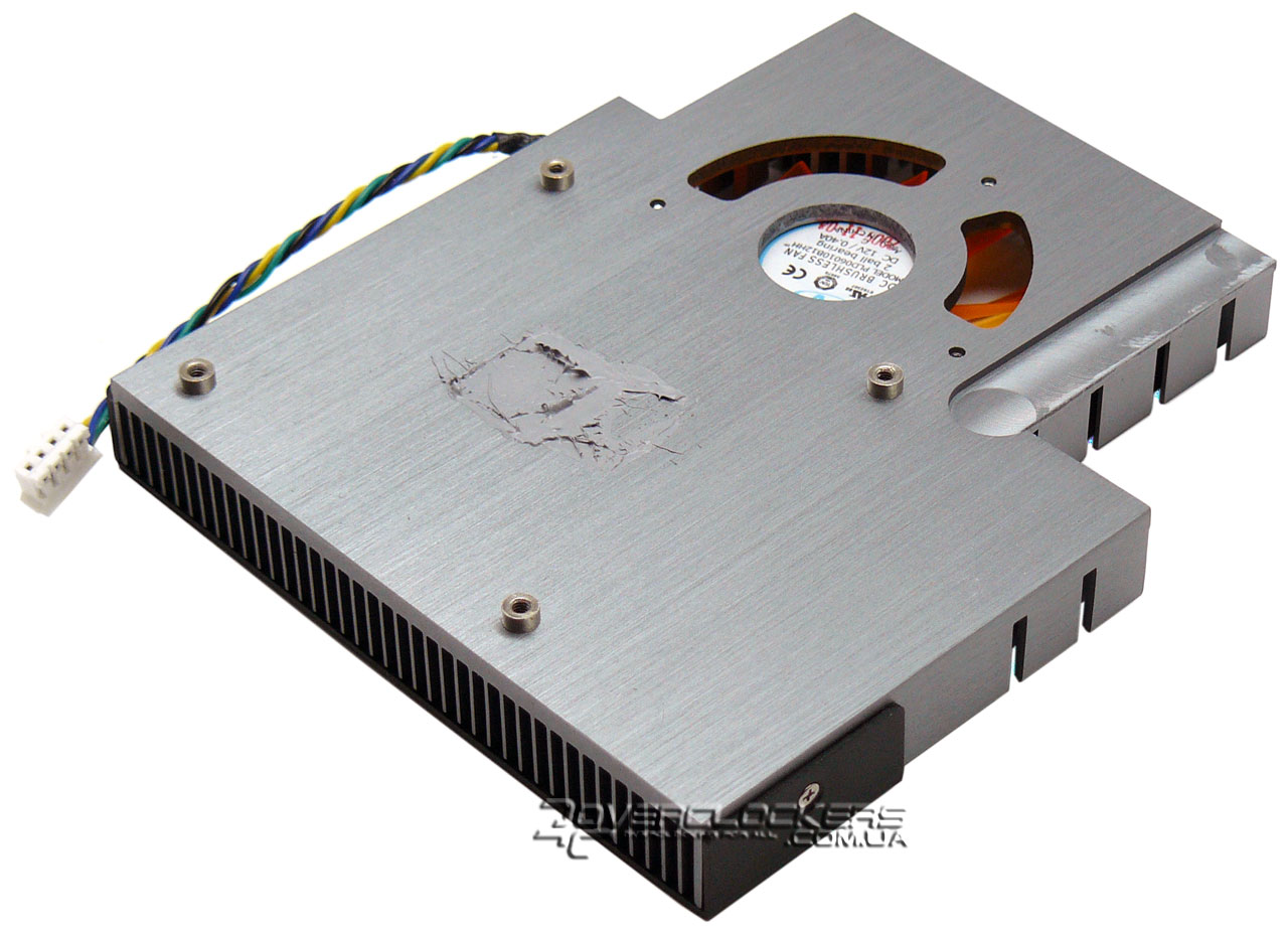Основное отличие это, естественно, система охлаждения, которая накрывает почти две трети карты, и часть не распаянных элементов. Кулер состоит из цельноалюминиевого радиатора, ребра которого продуваются небольшим по размерам вентилятором оранжевого цвета, питание и управление которого осуществляется по четырехконтактному разъемому.