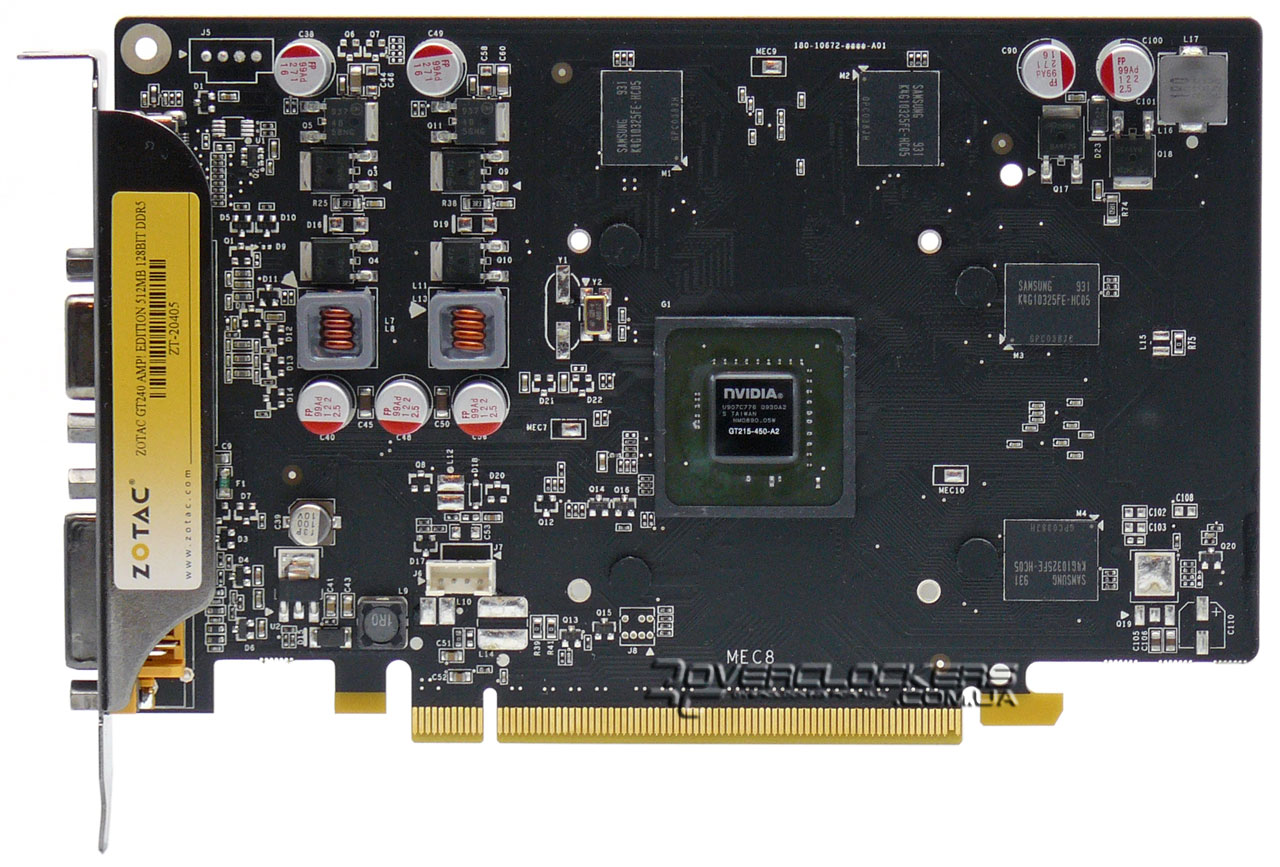Следующими по списку замены и переводу на прогрессивный техпроцесс стали народные акселераторы GeForce 9600 GT/GSO/GSO 512MB, которые уступают дорогу очередному адаптеру с поддержкой DirectX 10.1 — GeForce GT 240, основанному на чипе GT215. Для снижения себестоимости нового графического процессора контроллер памяти стал 128-битным, но способным работать как с памятью GDDR3, так и с GDDR5. Теперь для выпуска более производительной модели достаточно оснастить видеокарту современным типом памяти. Чип также претерпел некоторые изменения — как и у GeForce 9600 GSO количество потоковых процессоров составляет 96, число текстурных блоков равно 32, что соответствует GeForce 9600 GT. А вот ROP стало меньше всего — лишь 8 штук (для сравнения, в GeForce 9600 GSO/GSO 512MB их 12, а в GeForce 9600 GT — 16). Частота работы чипа больше соответствуют 9600 GSO, и составляет 550/1340 МГц для ядра и шейдерного домена. Память из-за различного типа и объема может работать в трех режимах: 3400 МГц для GDDR5 и 512 МБ, 2000 МГц для GDDR3 и 512 МБ, и 1800 МГц для GDDR3 объемом 1024 МБ. Такое разнообразие характеристик позволяет выпускать как минимум три модели GeForce GT 240. Правда, производители как всегда будут использовать частоты на свое усмотрение и конечный потребитель вряд ли будет об этом проинформирован.