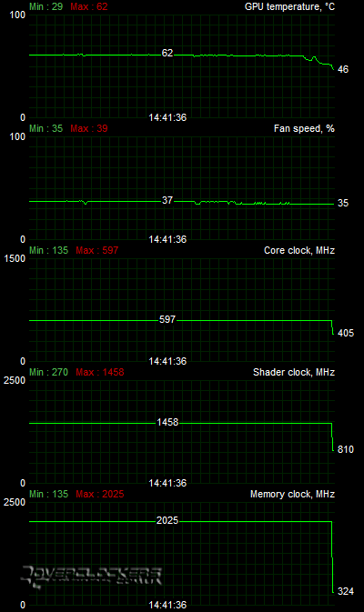 Утилита MSI Afterburner 1.3 показывает несколько другие значения — 597/1488 МГц и 4050 МГц. При малой нагрузке на карту частоты снижаются до 405/810 МГц по чипу и до 648 МГц по памяти. В режиме простоя эти частоты уже составляют 135/270 МГц и 270 МГц соответственно.