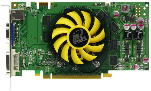 Дизайн карты собственной разработки Inno3D, который чем-то даже напоминает решение Sparkle, рассмотренное выше. Особо выделяется черный кулер с крупным желтым вентилятором.