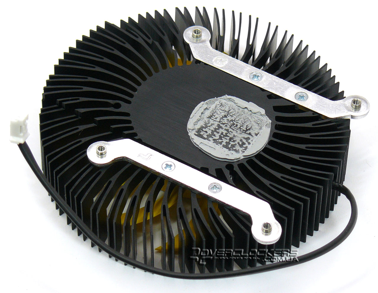Радиатор системы охлаждения выполнен из анодированного алюминия, при этом основание кулера смещено относительно ядра графического процессора. Аналогичная СО использовалась и ранее в продуктах Inno3D, но с белым вентилятором. Судя по всему, компания решила желтым цветом подчеркнуть отношение рассматриваемого адаптера к экономичным решениям.