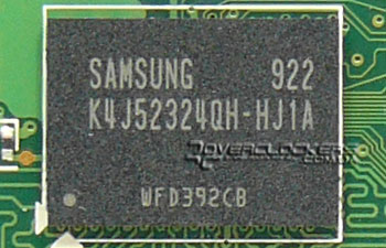 Тоже самое и память — восемь микросхем Samsung K4J52324QH-HJ1A со временем доступа 1,0 нс, рассчитанные на эффективные 2000 МГц. Общий объем равен 512 мегабайтам, шина — 256 бит.