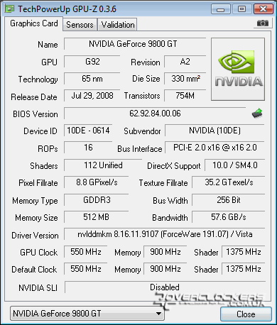 Рабочие частоты полностью соответствуют продуктам GeForce 9800 Green Edition и составляют 550/1375 МГц (555/1350 МГц по RivaTuner) для чипа и 1800 МГц для памяти.