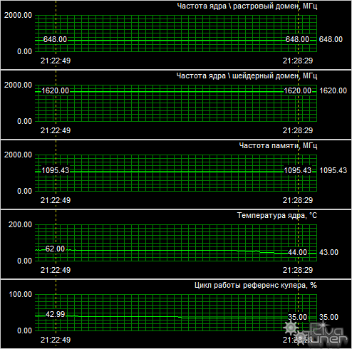 Разогнать адаптер удалось до 648/1620 МГц по чипу и до эффективных 2190 МГц по памяти, что для green-версии весьма неплохо.