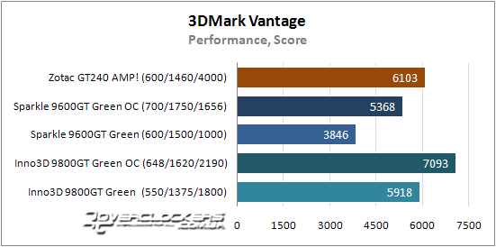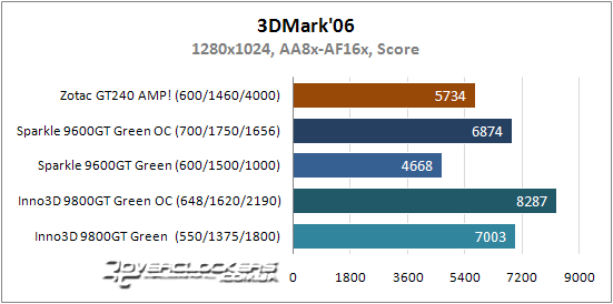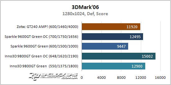 За счет более высокой частоты, адаптер Zotac GeForce GT240 AMP! по производительности сравним с GeForce 9800 GT Green Edition, работающий на стандартных частотах. А вот с разгоном уже начинает сдавать позиции. Решение Sparkle не спасает даже разгон — будь оно оснащено нормальной памятью, возможно, расстановка сил изменилась бы.