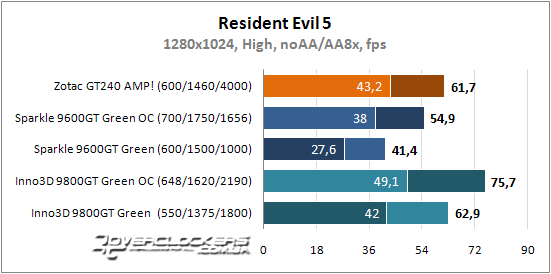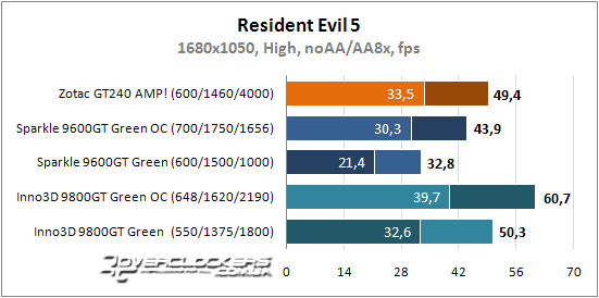 В новом бенчмарке Resident Evil 5 ситуация аналогична предыдущему пакету. Малая пропускная способность памяти модели SX96GT512D3G-VP не позволяет ей на равных конкурировать с остальными участниками, даже с разгоном. И опять продукт Zotac способен потягаться с экономичной версией GeForce 9800 GT, особенно, при активированном сглаживании.