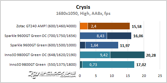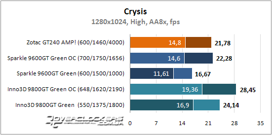 Игра Crysis более чувствительна к количеству функциональных блоков и GeForce GT 240 с заводским разгоном конкурирует лишь с «зеленой» версией 9600 GT с повышенными частотами.