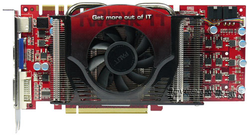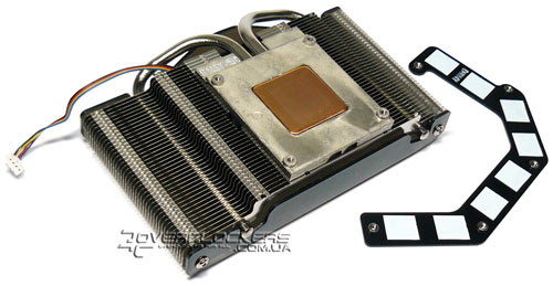 Конструкция системы охлаждения в отличие от карты Zotac имеет в своем активе две тепловые трубки и медное основание. Тонкие алюминиевые ребра продуваются обычным вентилятором, воздух от которого попутно охлаждает элементы подсистемы питания карты. Для охлаждения памяти предусмотрена пластина-радиатор, контактирующая с чипами через тонкие термопрокладки.