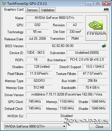 Видеоадаптер функционирует на частотах 745/1848/2200 МГц, чипа, шейдерный домен и память соответственно (данные по RivaTuner — 740/1836/2202 МГц).