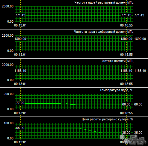 Разгон карты составил 771/1890 МГц по чипу и 2332 МГц по памяти, что несколько хуже предыдущего решения.