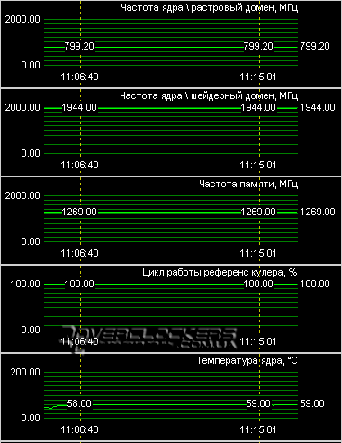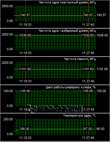 Данный экземпляр был разогнан до частоты ядра 800 МГц (шейдерные блоки функционировали на 1944 МГц), память разогнана до 2538 МГц. Для стабильной работы на повышенных частотах пришлось поднимать и обороты вентилятора (примерно до 90%).